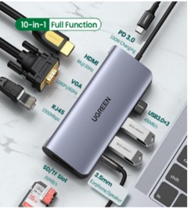 - Bộ chuyển đổi USB Type C to HDMI + VGA + LAN 1Gbps + Hub USB3.0 + SD/TF + Audio Ugreen 80133 cao cấp. là thiết bị chuyển đổi đa năng cao cấp chuyên dùng cho các thiết bị hỗ trợ cổng USB Type C đời mới như Macbook, Lenovo, HP... với các tính năng chính bao gồm: